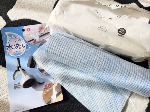 窓ふきは何年か前から、使い捨てのキッチンダスターとペーパータオルを使ってます。